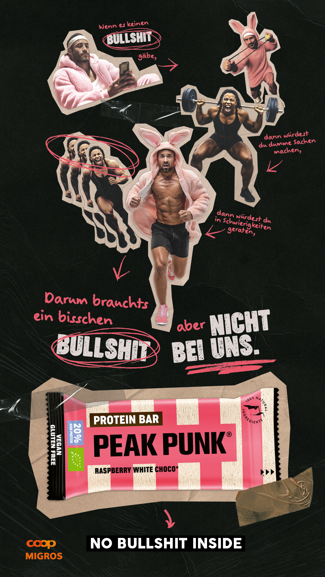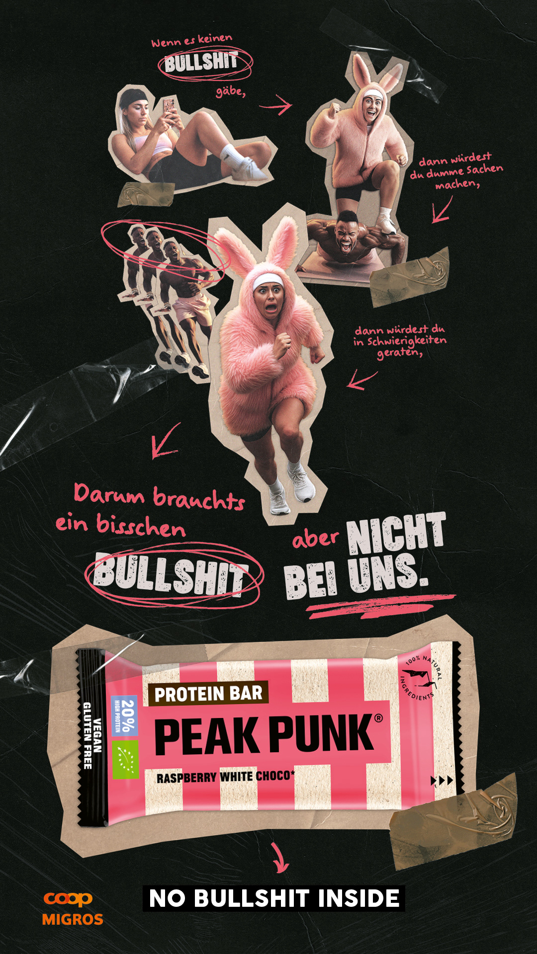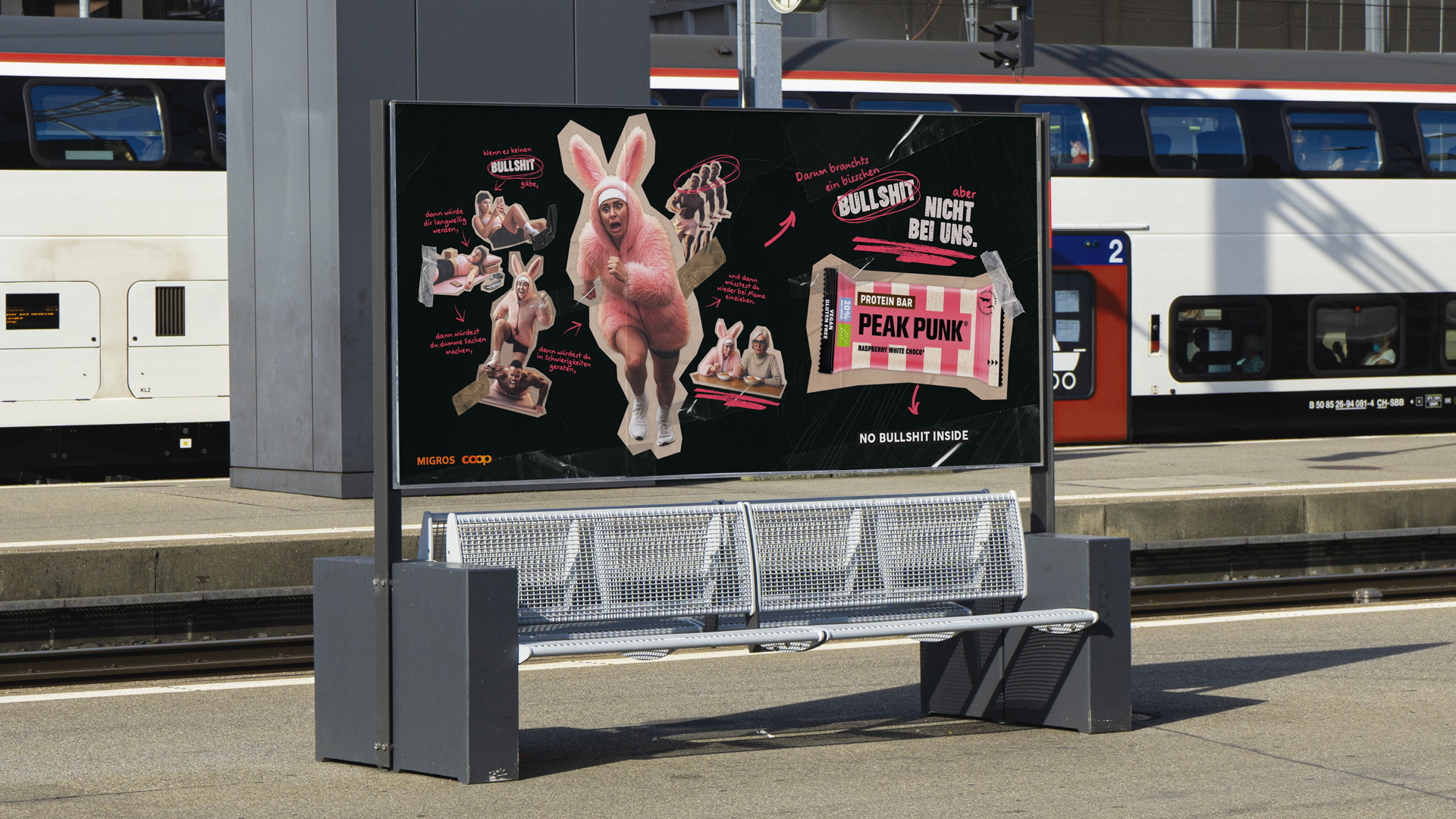 Herzstück der Kampagne sind zwei Online-Filme, die diese Szenarien humorvoll inszenieren und konsequent im Peak-Punk-Stil überdrehen. Ergänzt wird der Spot von DOOH, Display- und Social Media-Ads. Zudem werden Out-of-Home-Sujets eingesetzt, die ganz bewusst auf ein überladenes Storytelling setzen. Sie erscheinen allerdings ausschliesslich an Orten, wo die Zielgruppe genug die Zeit hat, die Stories in Ruhe zu entdecken und in die absurde Logik der Kampagne einzutauchen.